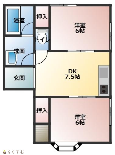 | 間取り | 2DK (洋室:6、6) ガスコンロ付/B・T別室/追い焚き機能/ユニットバス/給湯/シャワー/エアコン |