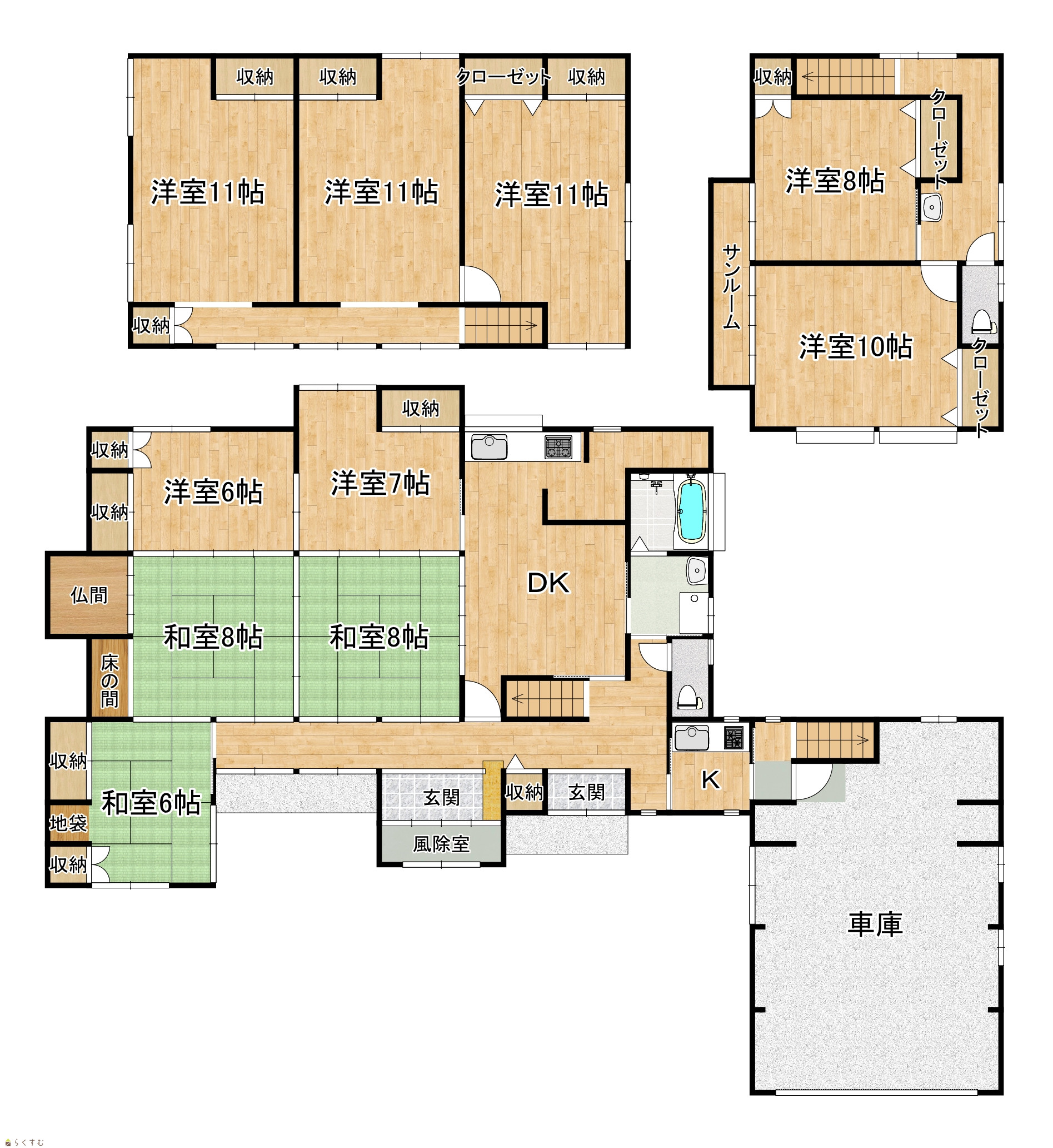 | 間取り | 10DK (和室:6畳、8畳、8畳) (洋室:6、7、11、11、11、8、10) DK |