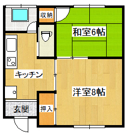 | 間取り | 2K (和室:6畳) (洋室:8) キッチン |