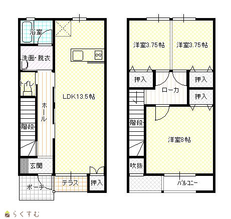 | 備考 | メゾネットタイプ 1階:LDK 13.5 2階:洋8・洋7 オール電化・IH・エアコン2台・シャワートイレ・バス追焚・屋外収納 ネット無料 |