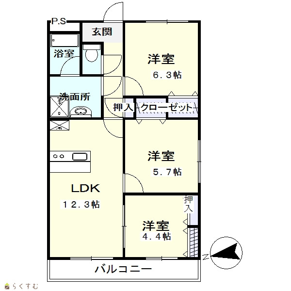 | 間取り | 3LDK (洋室:6.3、5.7、4.4) LDK12.3 |