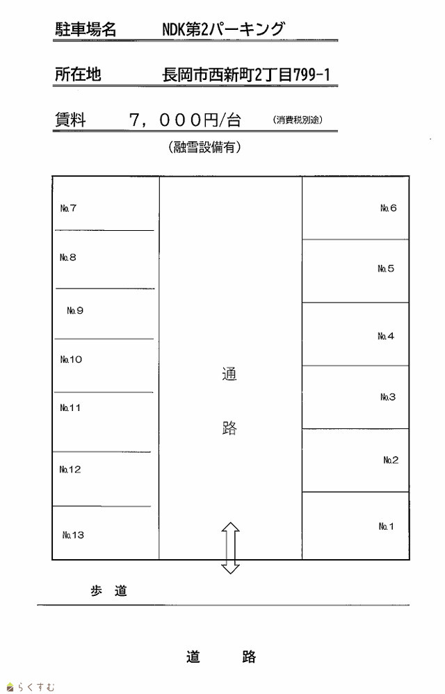 | 西新町2丁目「『NDK第2パーキング』 新潟県長岡市西新町2-799-1 | - - - | - - | 0.7万円 なし なし | なし なし なし | 駐車場 - |