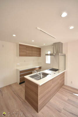 | 「子育てグリーン住宅支援事業」対象物件。広々とした洗面脱衣室は物干しスペースとしても利用可。2階洋室にウォークインクローゼット完備で収納スペースも充実。 家族同士のコミュニケーションが取りやすい対面キッチン、リビング階段。 | |||