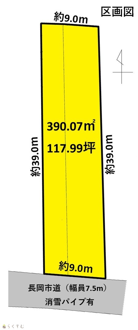 | 形状 | 間口 9m × 奥行 39m | 道路 | 市道(与板170号線)幅員7.5m 消雪パイプ有 |