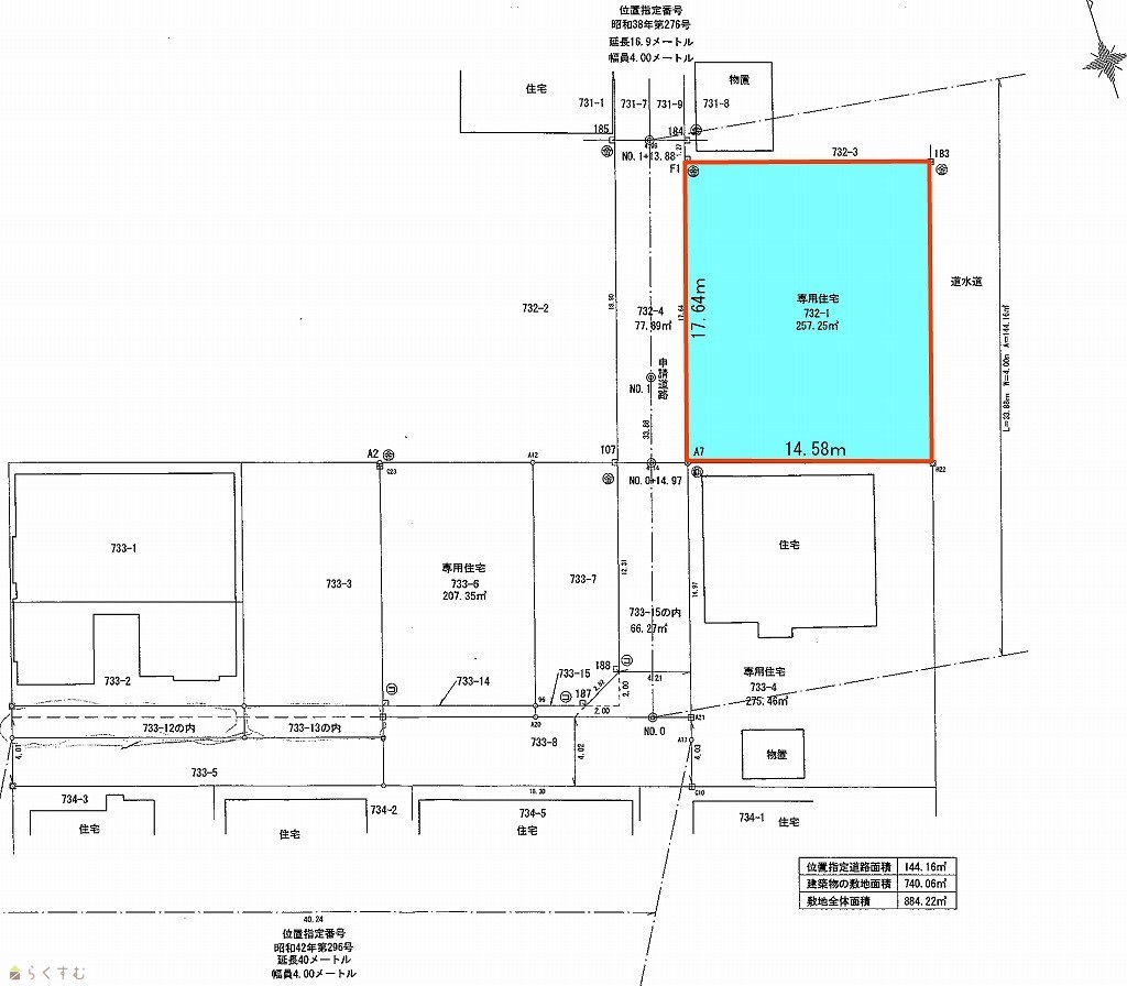 | 形状 | 間口 17.64m × 奥行 14.58m | 道路 | 西側:幅員4m位置指定道路第276号 |