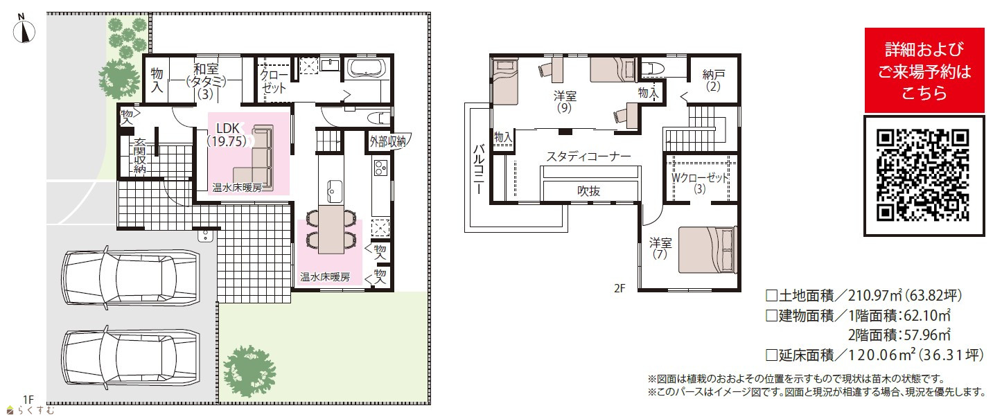 | 建物面積 | 1階 62.1㎡/ 2階 57.96㎡/ 計 120.06㎡ /36.31坪 | ||