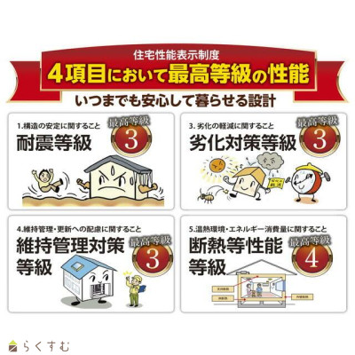 | 設備 | 角地、整形地、前面道路6m以上、耐震構造、LDK15畳以上、駐車場2台以上、TVインターホン、複層ガラス、システムキッチン、IHクッキングヒーター、食器洗浄乾燥機、追いだき機能付き、浴室暖房乾燥機、バス1坪以上、温水洗浄便座、シャワー付き洗面台、エアコン、24時間換気システム、オール電化、省エネ給湯、高気密高断熱住宅、上水道、下水道、電気、ウォークインクローゼット、全居室収納あり、照明器具付き | ||