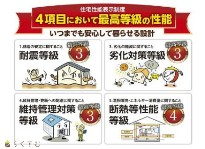 | 設備 | 前面道路6m以上、日当り良好、閑静な住宅街、耐震構造、LDK15畳以上、全室フローリング、駐車場2台以上、TVインターホン、複層ガラス、システムキッチン、IHクッキングヒーター、食器洗浄乾燥機、追いだき機能付き、浴室暖房乾燥機、温水洗浄便座、シャワー付き洗面台、エアコン、24時間換気システム、オール電化、省エネ給湯、高気密高断熱住宅、上水道、下水道、電気、ウォークインクローゼット、全居室収納あり、照明器具付き | ||