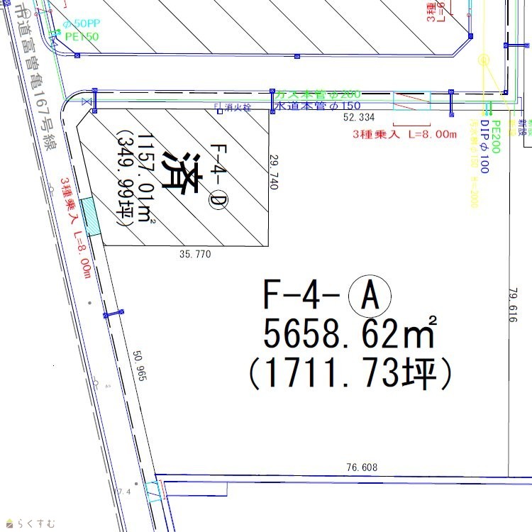 | 形状 | 間口 52m × 奥行 79m | 道路 | 北側 市道 幅員12m・西側 市道 幅員9.5m |