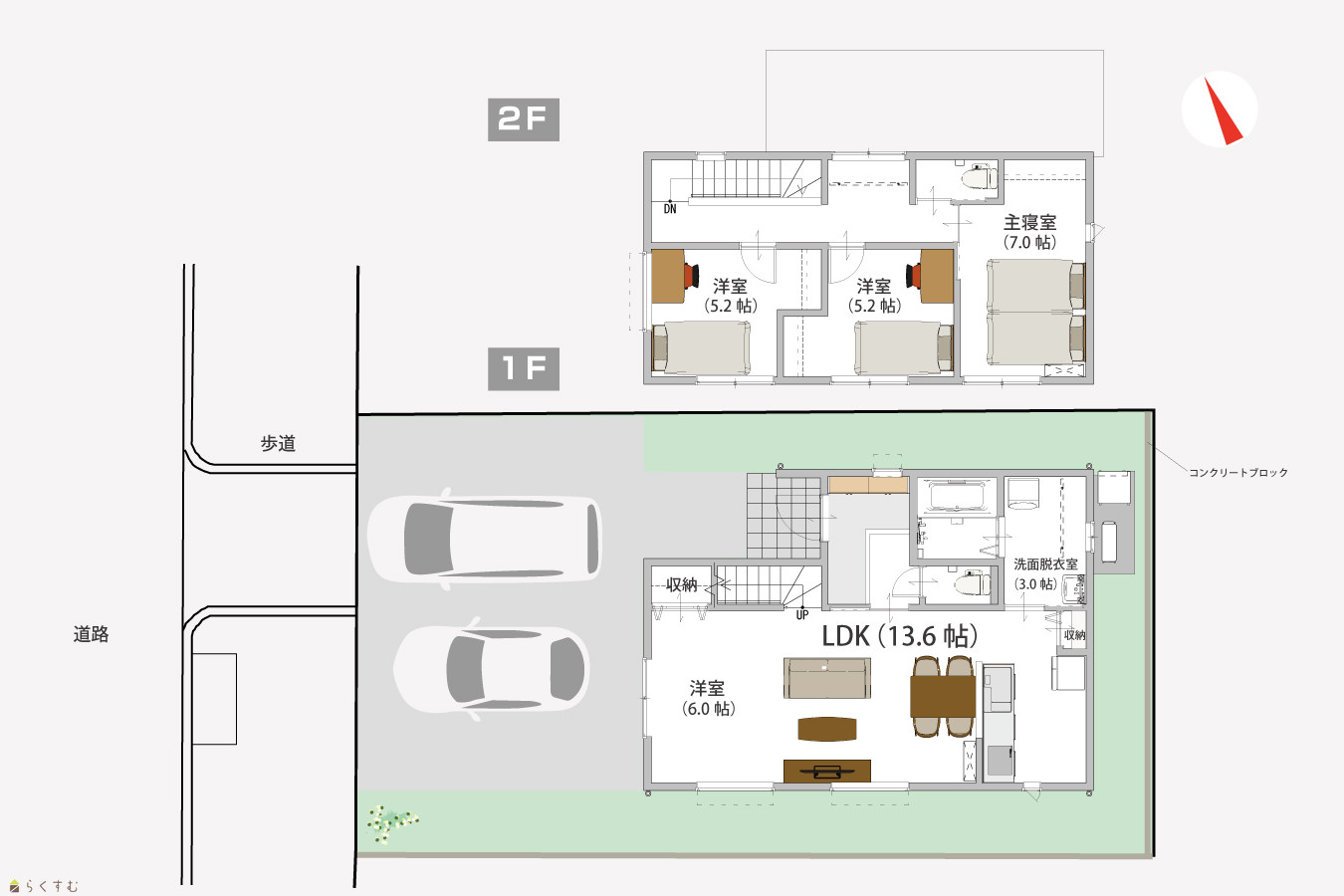 4LDK (洋室:7、6、5.2、5.2) LDK13.6帖 |