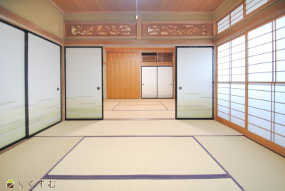 | LDKは広々18帖、対面キッチンです♪和室・洋室全居室8帖以上で広い納戸にはシーズンオフの家電等収納可。駐車2台、景観の良い庭付きです。 | |||