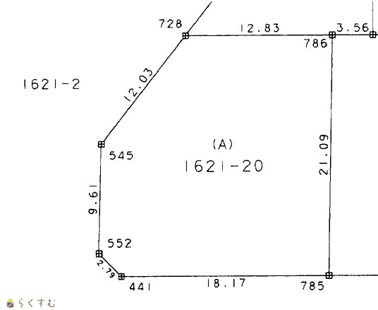 | 形状 | 間口 18.17m × 奥行 21.09m | 道路 | 南側(幅員:6m)、西側(幅員5m) |