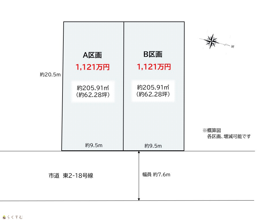 | 備考 | ※測量依頼済みです。区画図、間口・奥行きは概算で記載しています。 区割りの変更は可能ですのでご相談ください。 |
