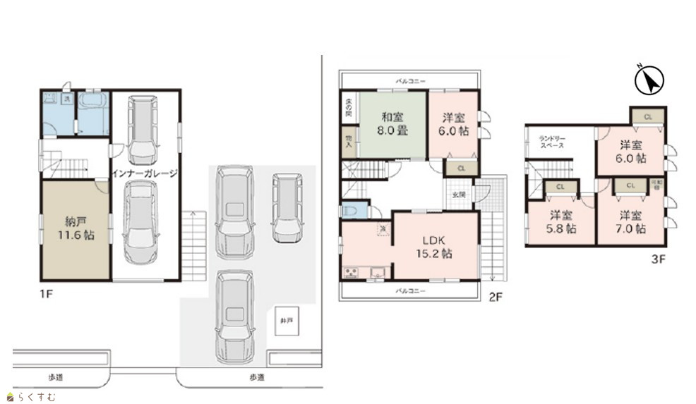 5LDK (和室:8.0畳) (洋室:7.0、6.0、6.0、5.8) LDK15.2 納戸11.6帖、ランドリースペース有 |