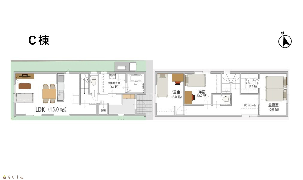 3LDK (洋室:6.0、6.0、5.5) LDK15.5 洗面脱衣室3帖、WIC2帖、土間収納あり |