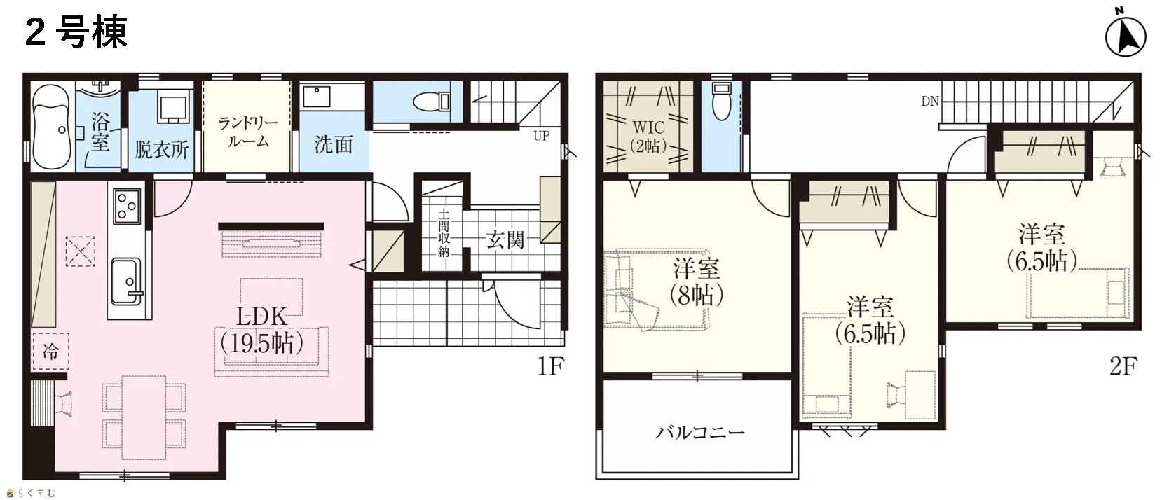 3LDK (洋室:8、6.5、6.5) LDK19.5 ランドリールームあり |