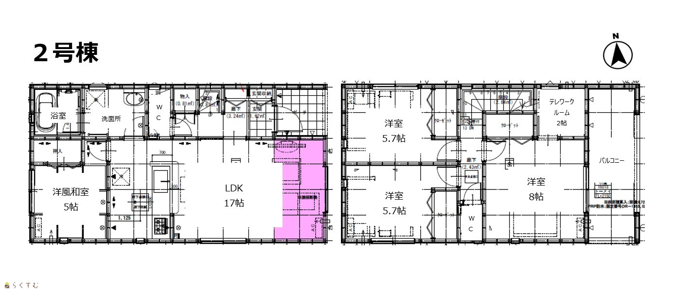 4LDK (和室:8.0畳) (洋室:8.0、5.7、5.7) LDK17 2階に2帖のテレワークルーム有 |