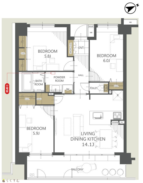3LDK (洋室:6.0、5.9、5.8) LDK14.1 |
