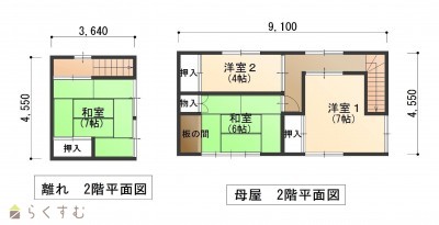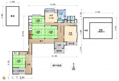 8LDK (和室:10畳、8畳、8畳、6畳、8畳、6畳、7畳) (洋室:7、4) 車庫(19.83㎡)、作業所(77.68㎡) |