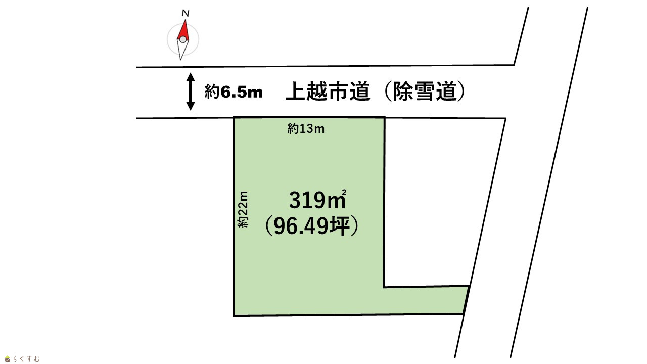 | 形状 | 間口 13m × 奥行 22m | 道路 | 北側:公道 約6.5m |