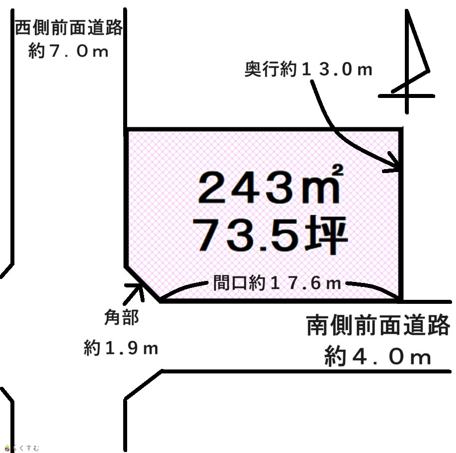 | 形状 | 間口 17.6m × 奥行 13.0m | 道路 | 南側約4.0m、西側約7.0m |