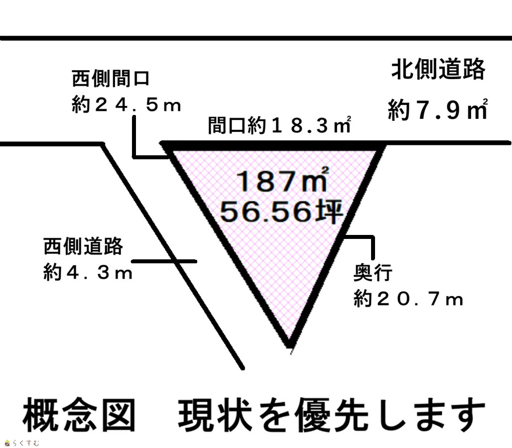 | 形状 | 間口 18.3m × 奥行 20.7m | 道路 | 北側約7.9m、西側約4.3m |