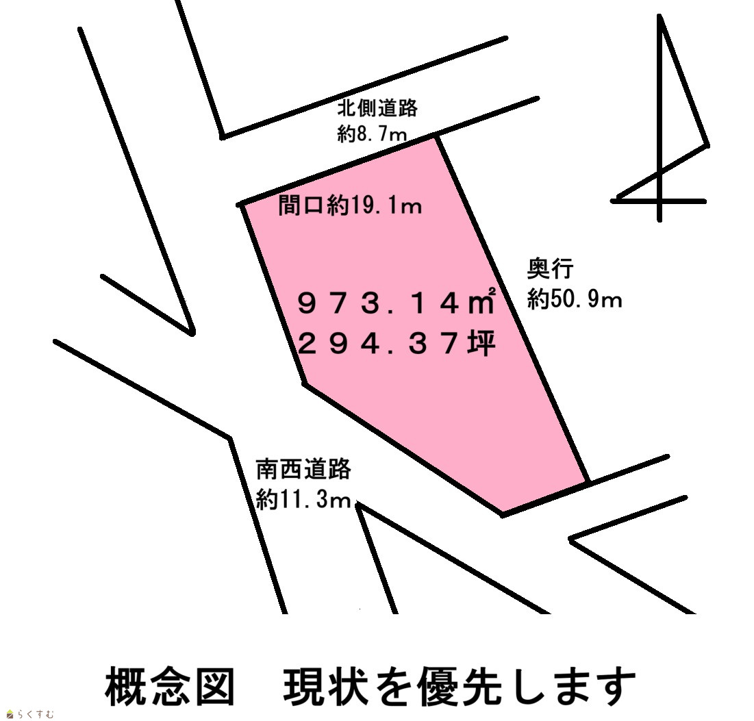 | 形状 | 間口 19.1m × 奥行 50.9m | 道路 | 北側約8.7m、西側約11.3m、南側約4.2m |
