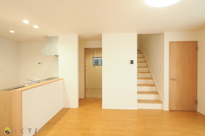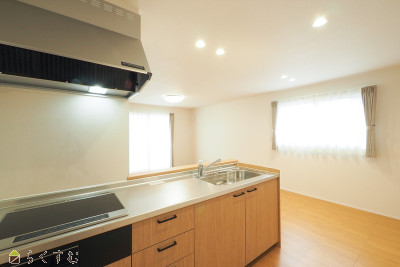 2025年10月完成。ご家族やお客様との会話も楽しめる対面キッチン。全居室に収納付き、共用スペース収納もあり、すっきり片づけて広く使えます。