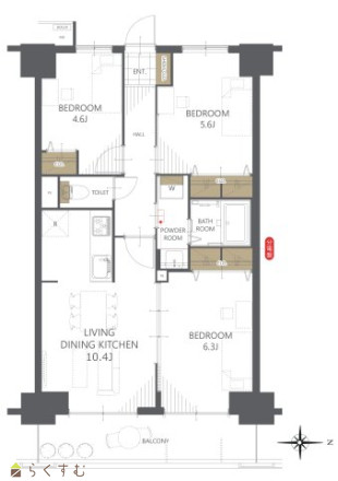 3LDK (洋室:6.3、5.6、4.6) LDK10.4 |