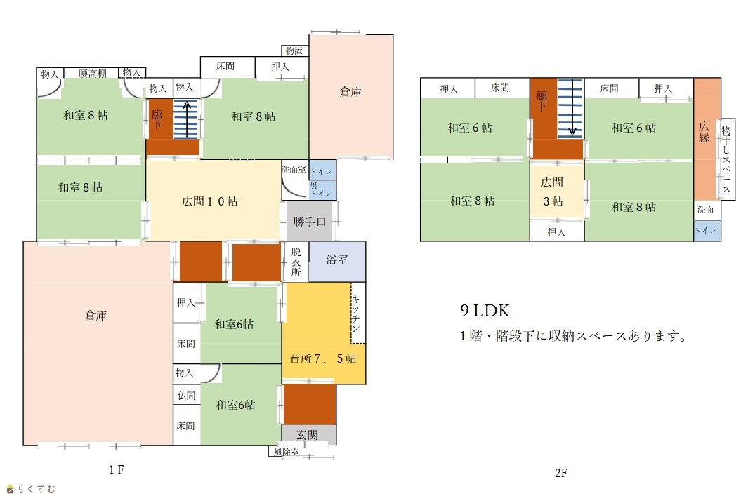 9LDK (和室:6畳、6畳、8畳、8畳、8畳、6畳、6畳、8畳、8畳) DK7.5 増築年月日:昭和44年 昭和45年 昭和51年 昭和63年 平成5年 建物登記されておりません。 |