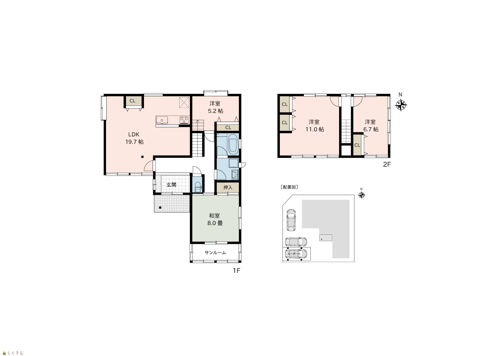 4LDK (和室:8.0畳) (洋室:11.0、6.7、5.2) LDK19.7 |