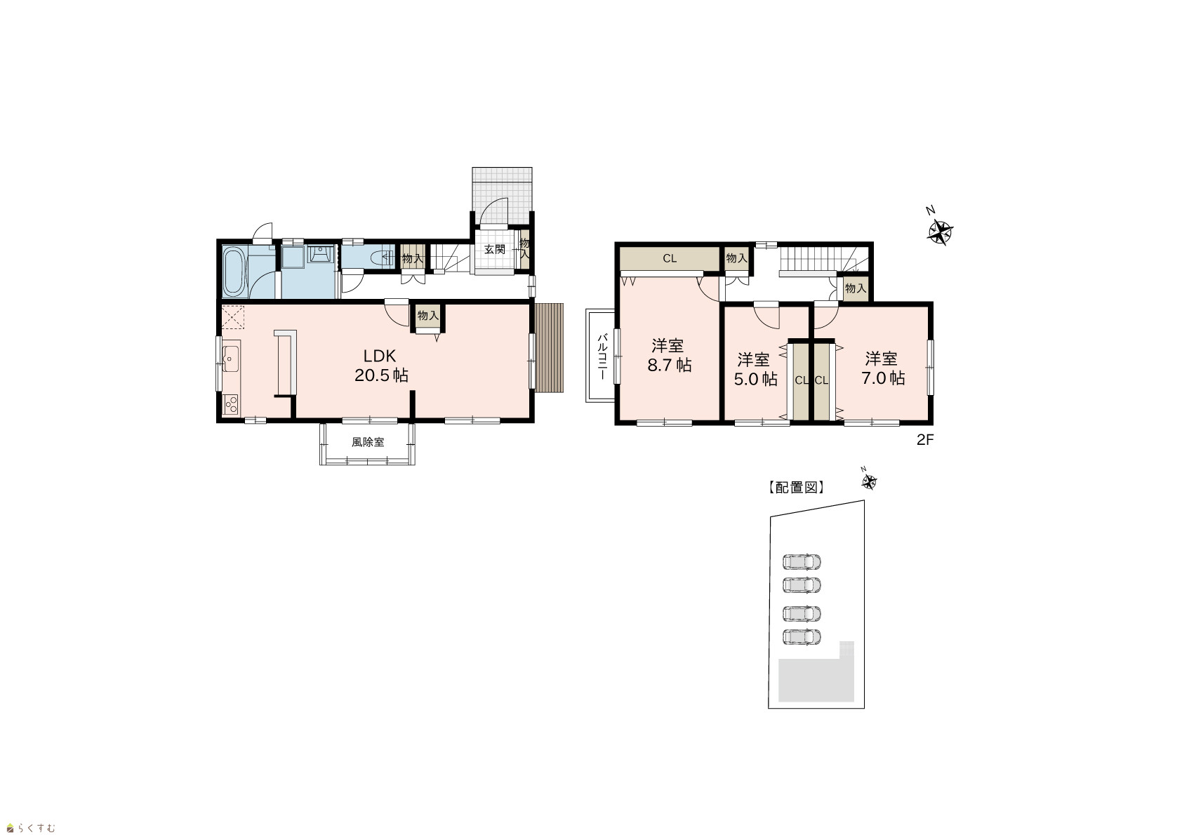 3LDK (洋室:8.7、7.0、5.0) LDK20.5帖 |