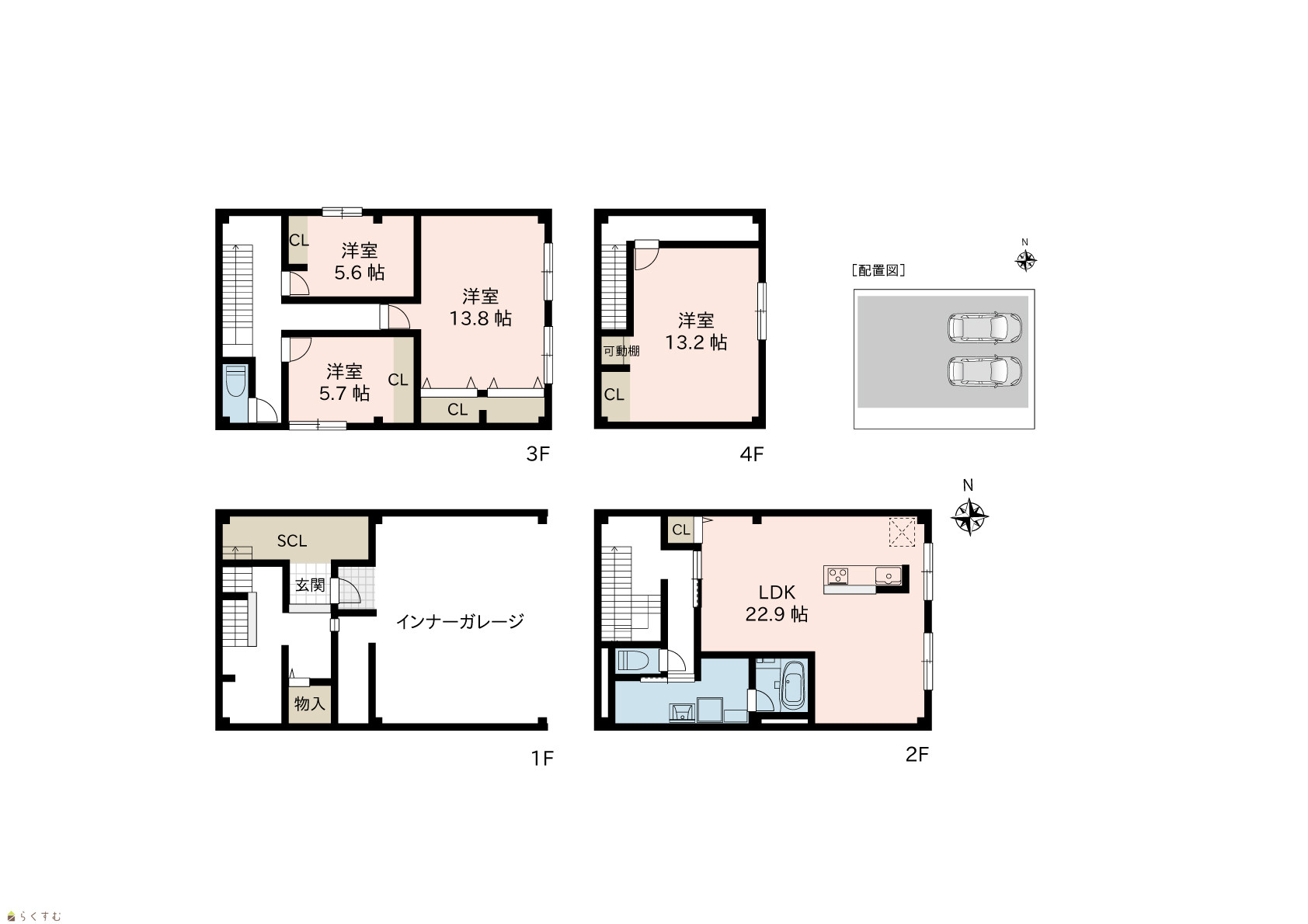4LDK (洋室:13.8、13.2、5.7、5.6) LDK22.9 |