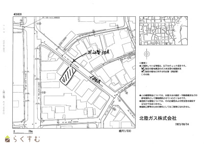 | 設備 | 整形地、更地、建築条件なし、即引き渡し可、側溝、都市ガス(前面道路)、上水道(前面道路)、下水道(前面道路)、都市ガス(宅地内)、上水道(宅地内)、前面道路融雪設備あり、住宅向け、事業用向け | ||