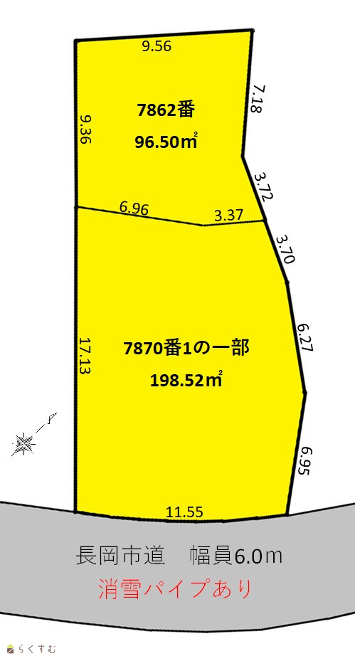 | 形状 | 間口 11.55m × 奥行 26.49m | 道路 | 長岡市道(幅員6.0m)消雪パイプあり |