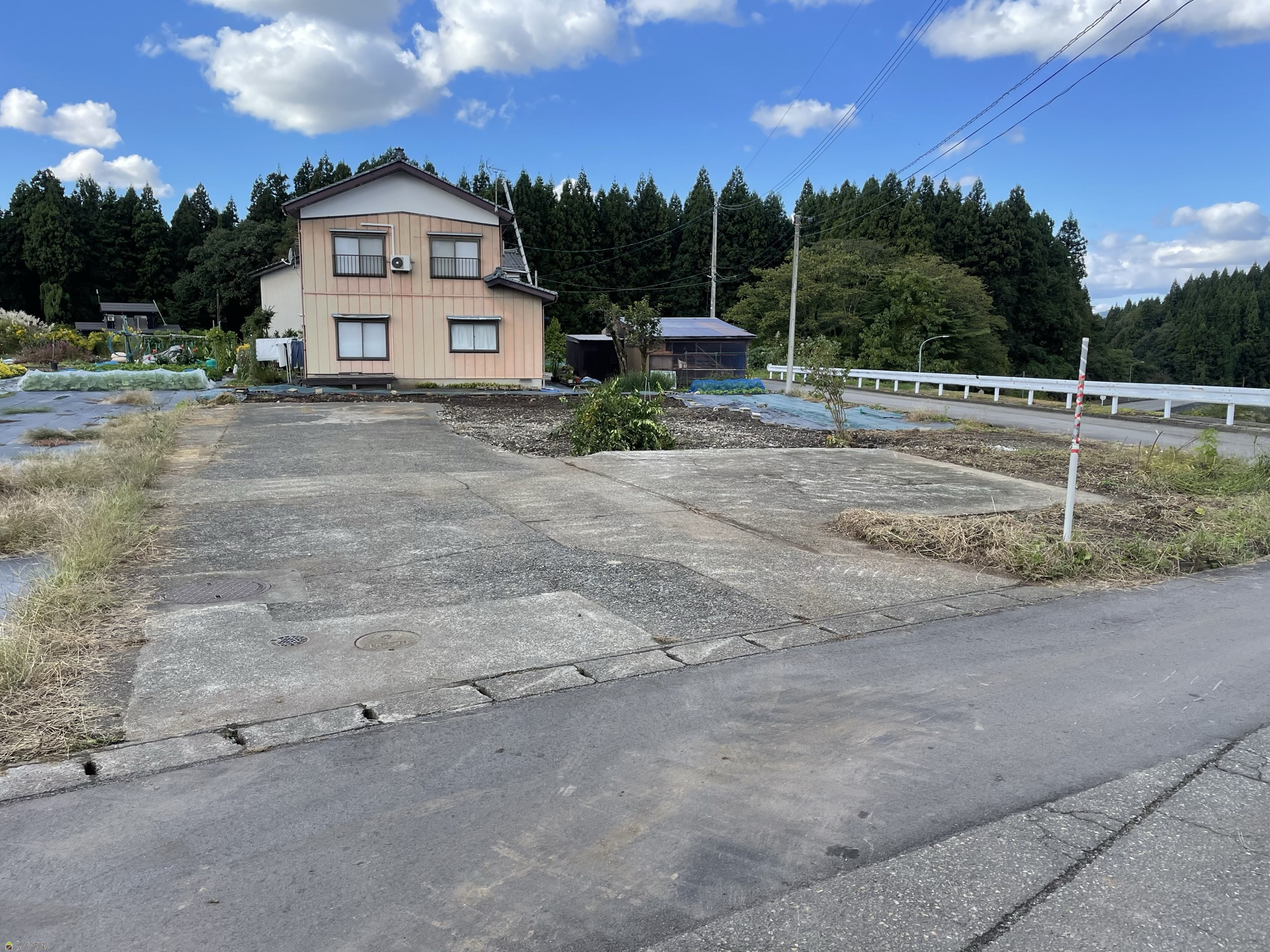 | 備考 | 水道口径は13㎜のままお引渡しを行います。 農地法5条許可申請が必要になります。 コンクリート舗装あり(現況にてお引渡し)。 防火水槽あり。 契約不適合責任免責。 |