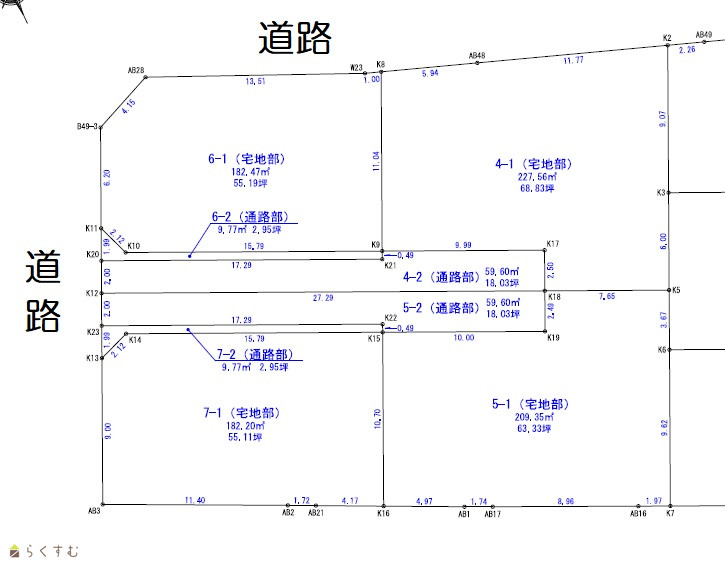 | 備考 | 敷地南側に電線及び電柱があります(移設不可)。 法面は現状にてのお引渡しとなります。 宅地部分とは別に通路部分(公衆用道路)59㎡有。 |