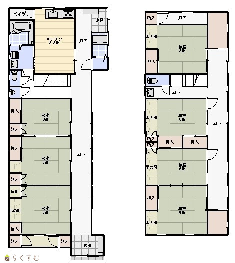 7DK (和室:6畳、8畳、8畳、6畳、6畳、8畳、8畳) DK8.8 |