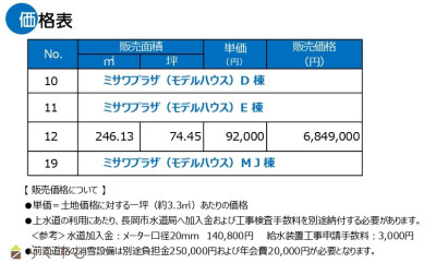 | 備考 | ・ミサワホーム建築条件付き ・前面道路の消雪設備は別途負担金250,000円および年会費20,000円が必要 |