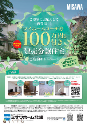 | 備考 | <QUOカードプレゼントに関しまして> ※1家族1回限り ※将来的に住まいづくりを検討の方限定で、未成年・学生の方は除きます ※特典のみの目当てで来場された方には特典をお渡しでいない場合がござます 価格改定 旧価格3,750万円(2024/8/29)→新価格3,580万円(2025/10/10) |