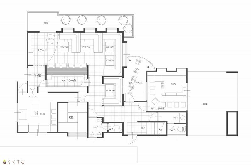 | 間取り | 1階:厨房エリア(厨房機器設備なし)・カウンター席・客席・ステージ・和室4.5帖1室・トイレ2ヵ所・1階洋室8帖1室/2階和室10帖2室 | ||