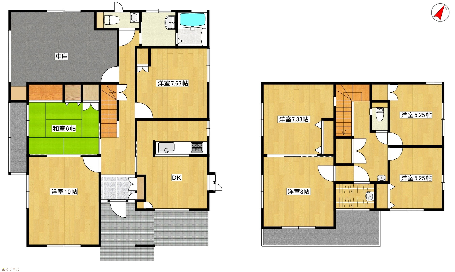 7DK (和室:6.0畳) (洋室:10、7.6、8、7.3、5.25、5.25) DK9.5 敷地内に電柱と支線があります |