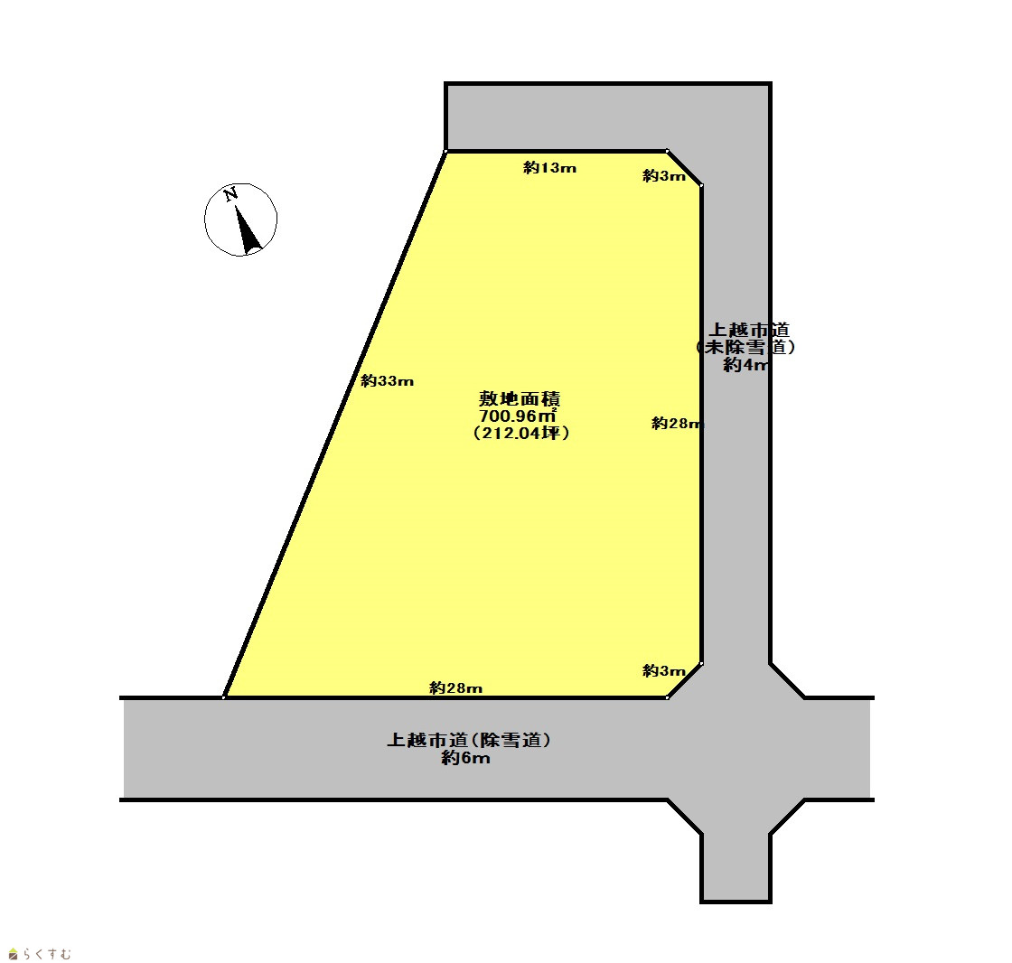 | 形状 | 間口 28m × 奥行 28m | 道路 | 南側6m(除雪道)、東及び北側4m(未除雪道) |