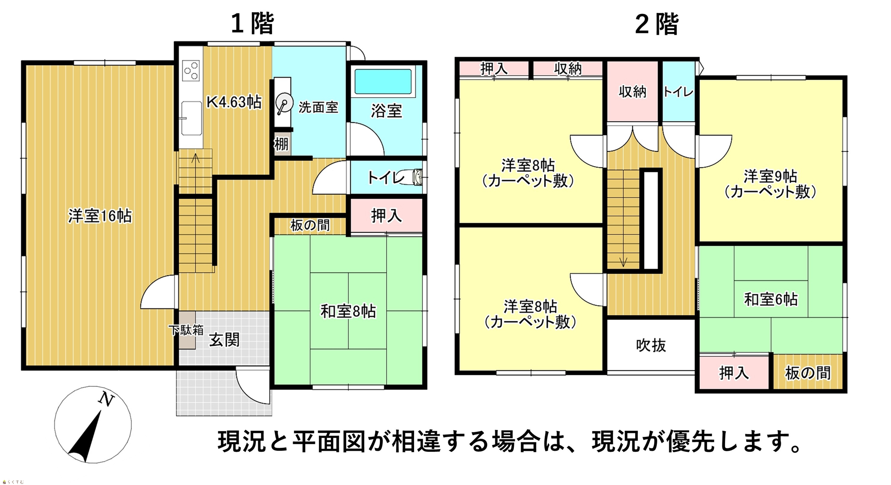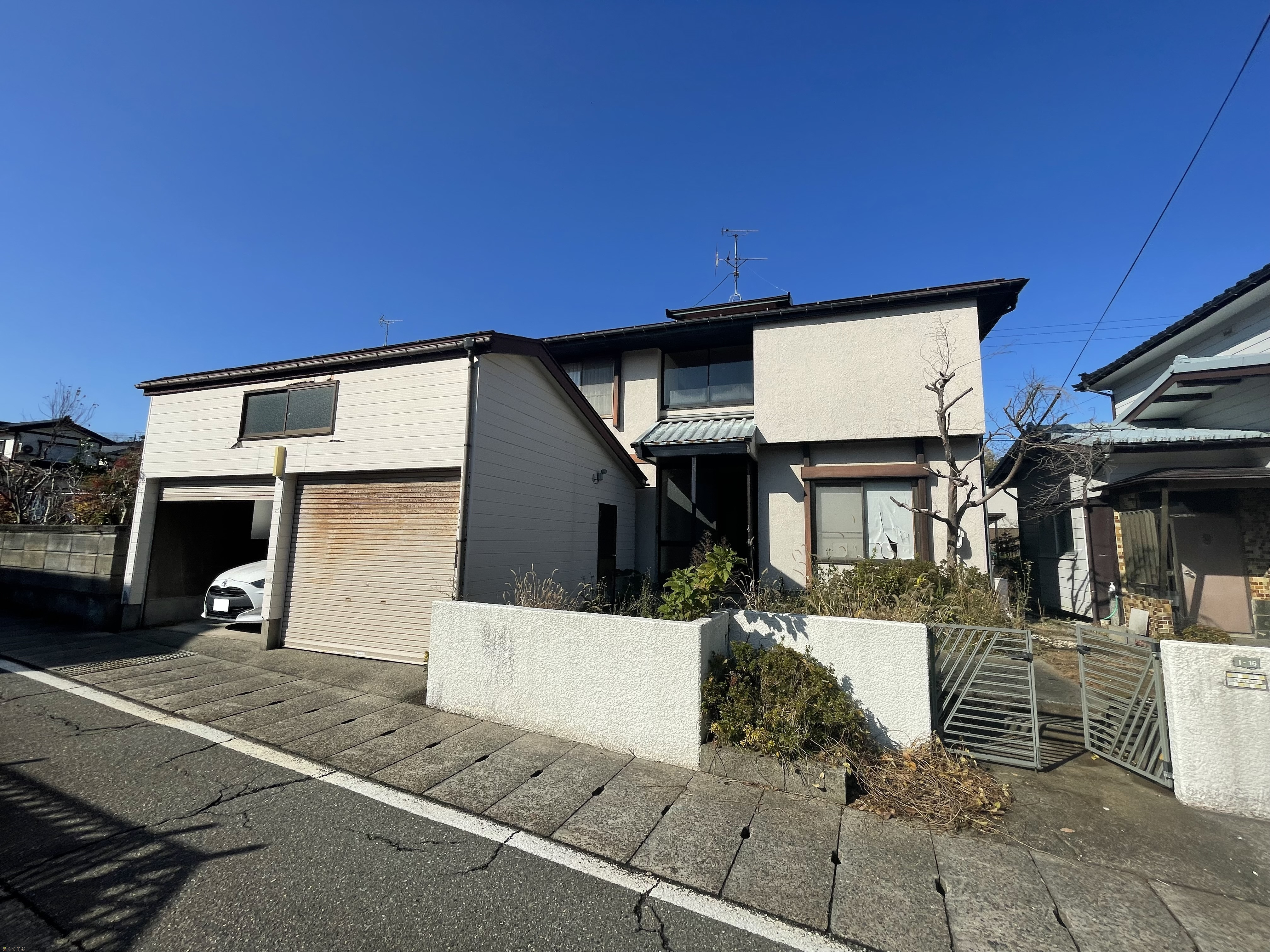 | 備考 | ・本物件は、売主の契約不適合責任を免責とし、現況のままでのお引渡しとなります。 ・給湯器の故障、各種ライフライン配管の劣化、建物内外部の損耗、外壁剥がれからの雨漏り等、修繕を要する箇所がございます。内容をご理解のうえ、ご内覧をお願いいたします。(建物状況調査実施済み) ・主な修繕を要する箇所:外壁張替、屋根葺替、内部クロス交換、床フロア張替、建具交換・修繕、給湯器交換、配管修繕、その他補修。 ・車庫は未登記となっております。 ・接道は北側、南側となりますが、車両乗入れは南側となります。 |