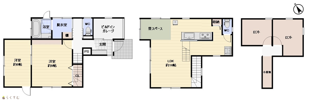2LDK (洋室:9、6) LDK16 ビルトインガレージ、ロフト×2、小屋裏収納あり |