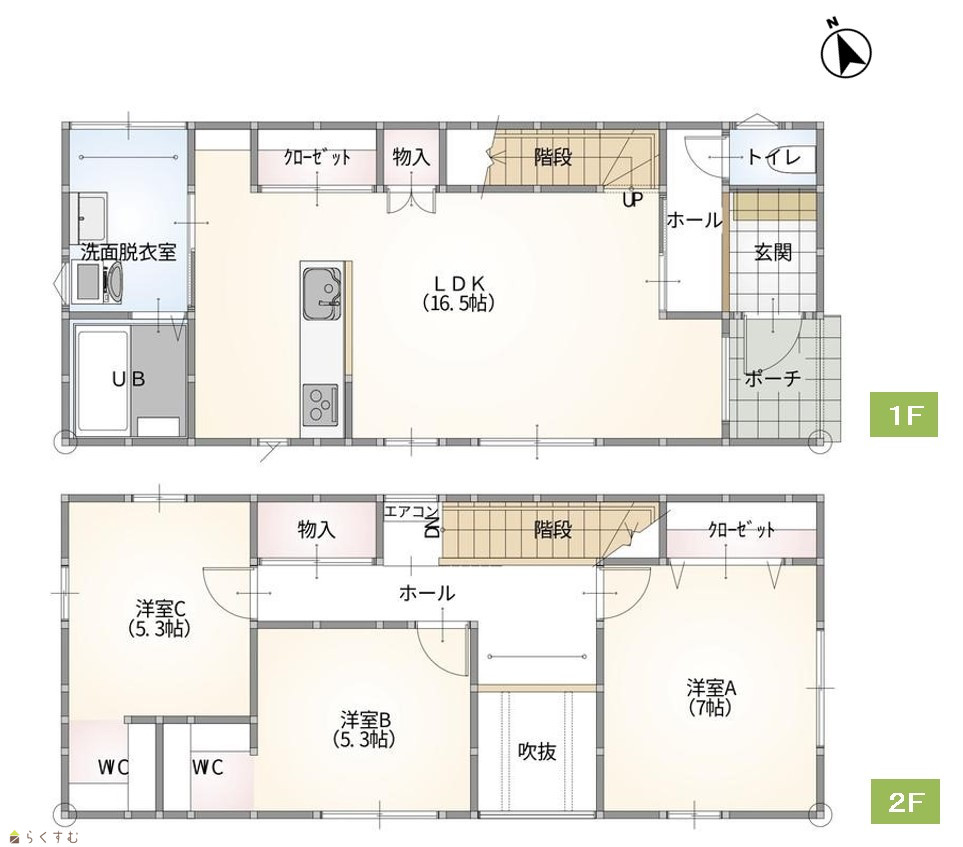 3LDK (洋室:7.0、5.3、5.3) LDK16.5 リビング収納・2階ホール収納・2箇所ウォークインクローゼットあり |