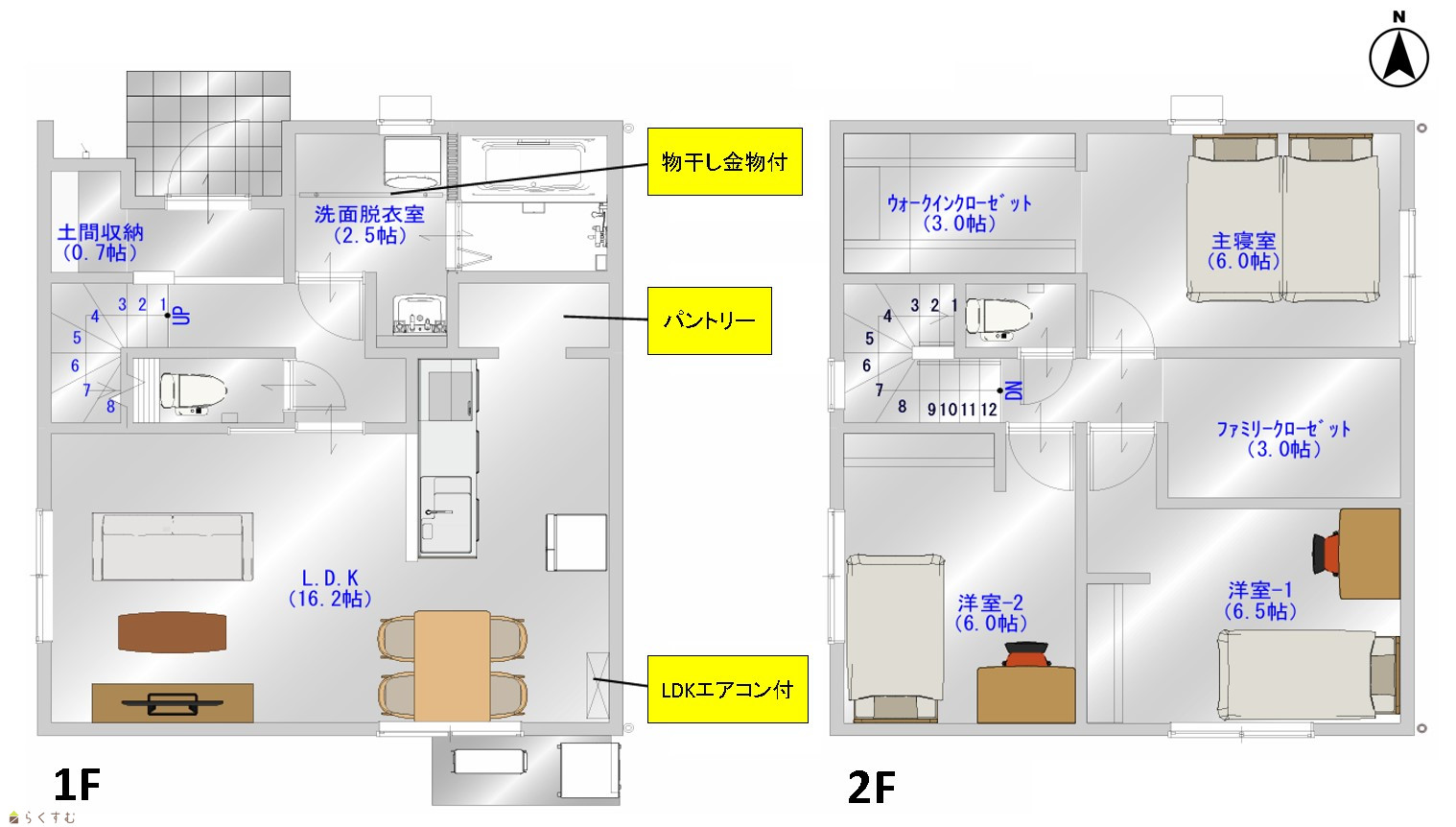 3LDK (洋室:6.5、6、6) LDK16.2 ウォークインクローゼット3帖、ファミリークローゼット3帖、土間収納0.7帖あり |
