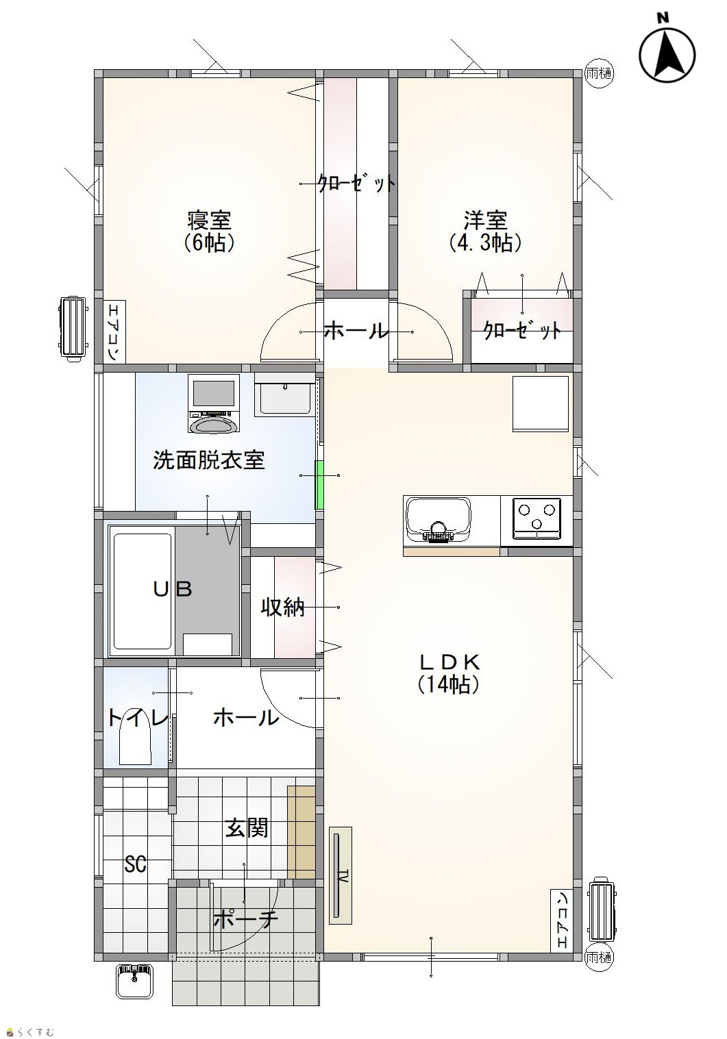 2LDK (洋室:6、4.3) LDK14 リビング収納・シューズクロークあり |