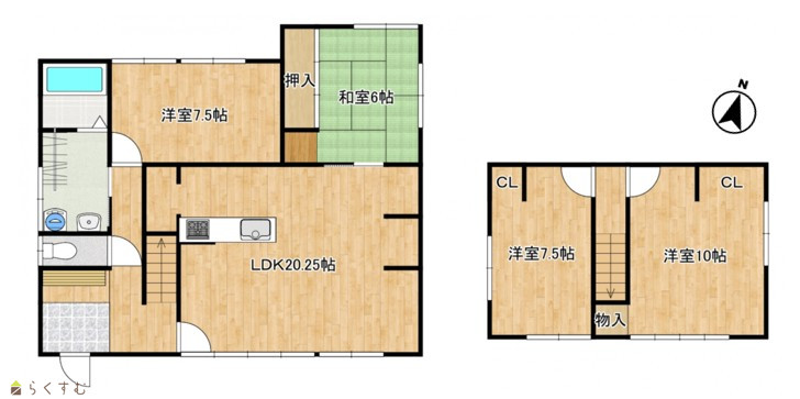 4LDK (和室:6畳) (洋室:10、7.5、7.5) LDK20.25 |