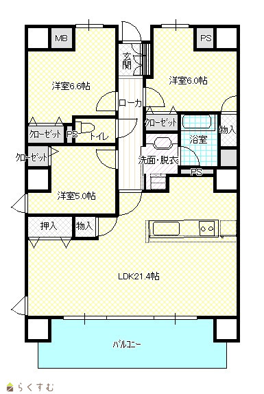 3LDK (洋室:6.6、6、5) LDK21.4 |